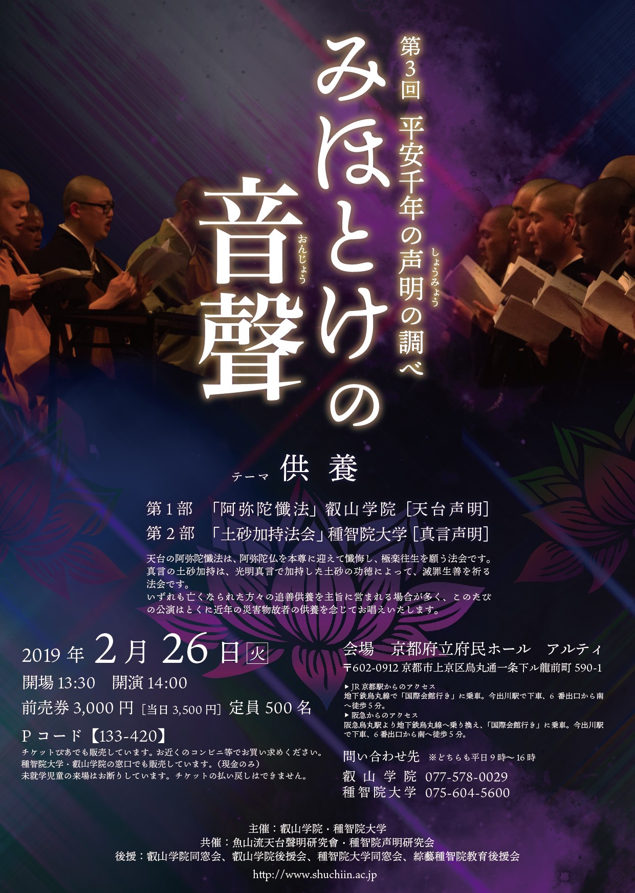 2019年02月26日 第三回 みほとけの音聲 平安千年の声明の調べ ー供養ー 平成三十一年二月二十六日(火)午後二時より、京都府民ホール・アルティに於いて、種智院大学の学生・声明研究会員と共に「第三回 みほとけの音聲 平安千年の声明の調べ」に出演いたします。毎年、天台宗・叡山学院との共演で好評です。入場券はチケットぴあ、コンビニ等で販売されています。 是非、ご来場下さい。 ポスターをクリックすると拡大します。