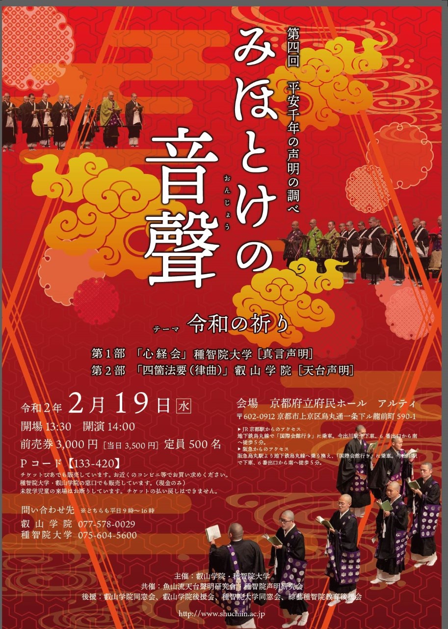 令和2年2月19日(水)午後2時より、京都府民ホール・アルティに於いて、種智院大学の学生・声明研究会員と共に「第四回 みほとけの音聲 平安千年の声明の調べ」に出演いたします。