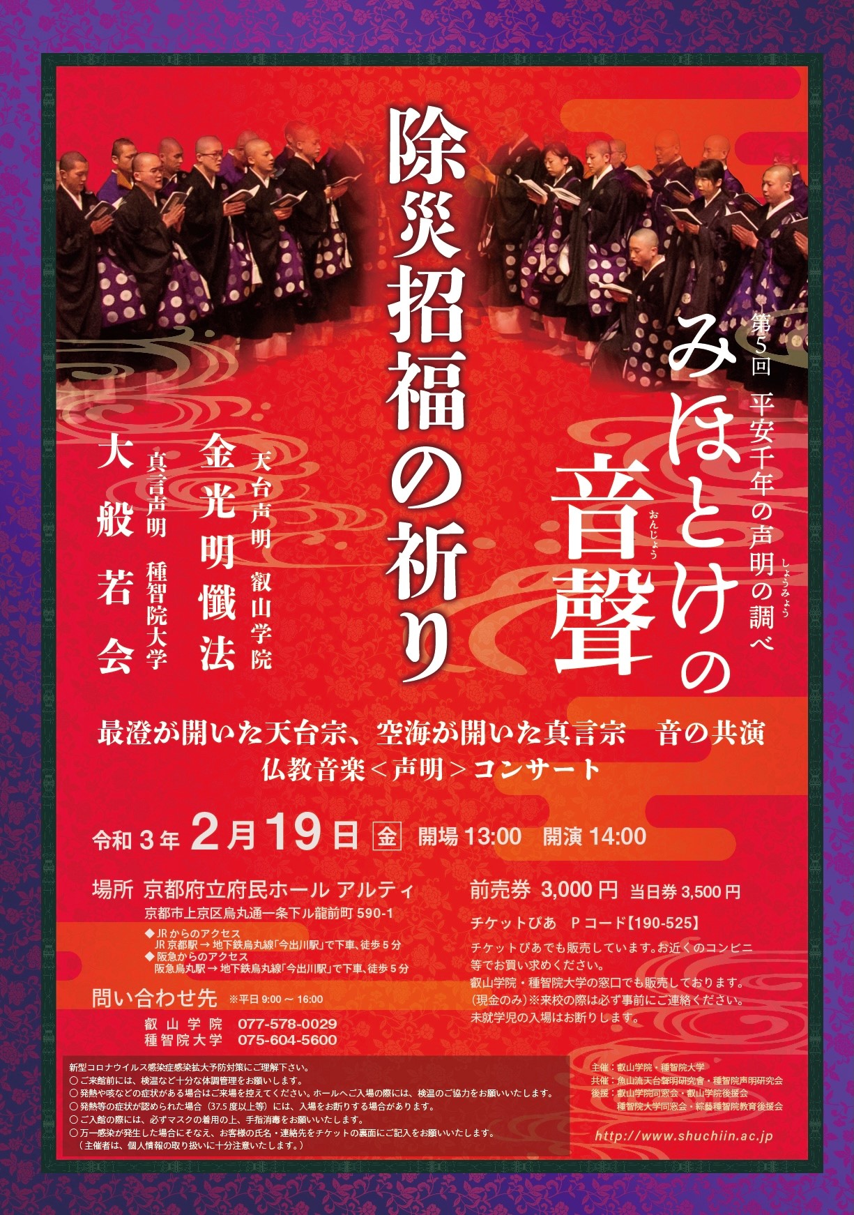 令和3年2月19日(金)午後2時より、京都府立府民ホール・アルティに於いて、種智院大学の学生と共に、「第五回 平安千年の声明の調べ みほとけの音聲 除災招福の祈り」に出演いたします。