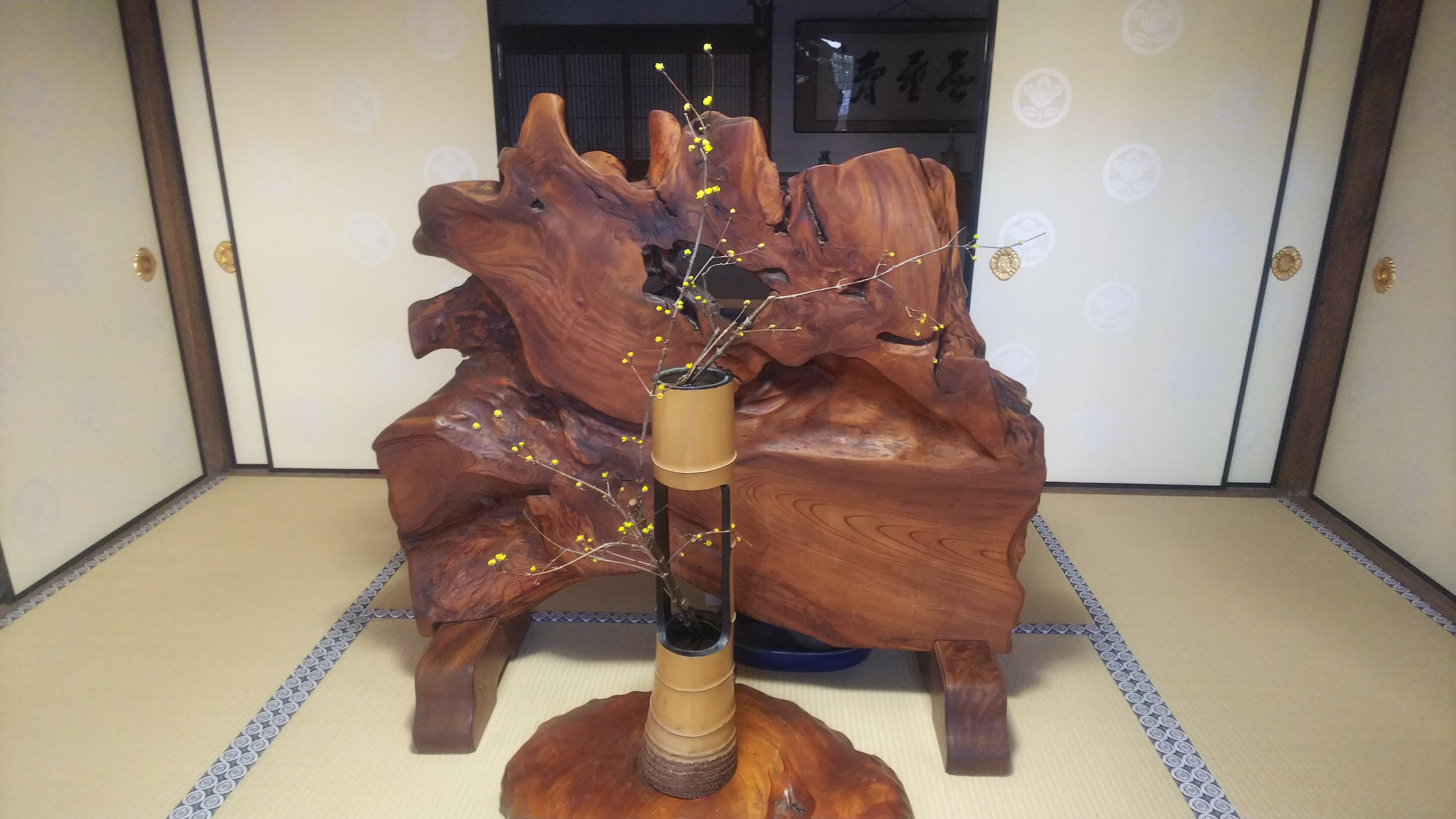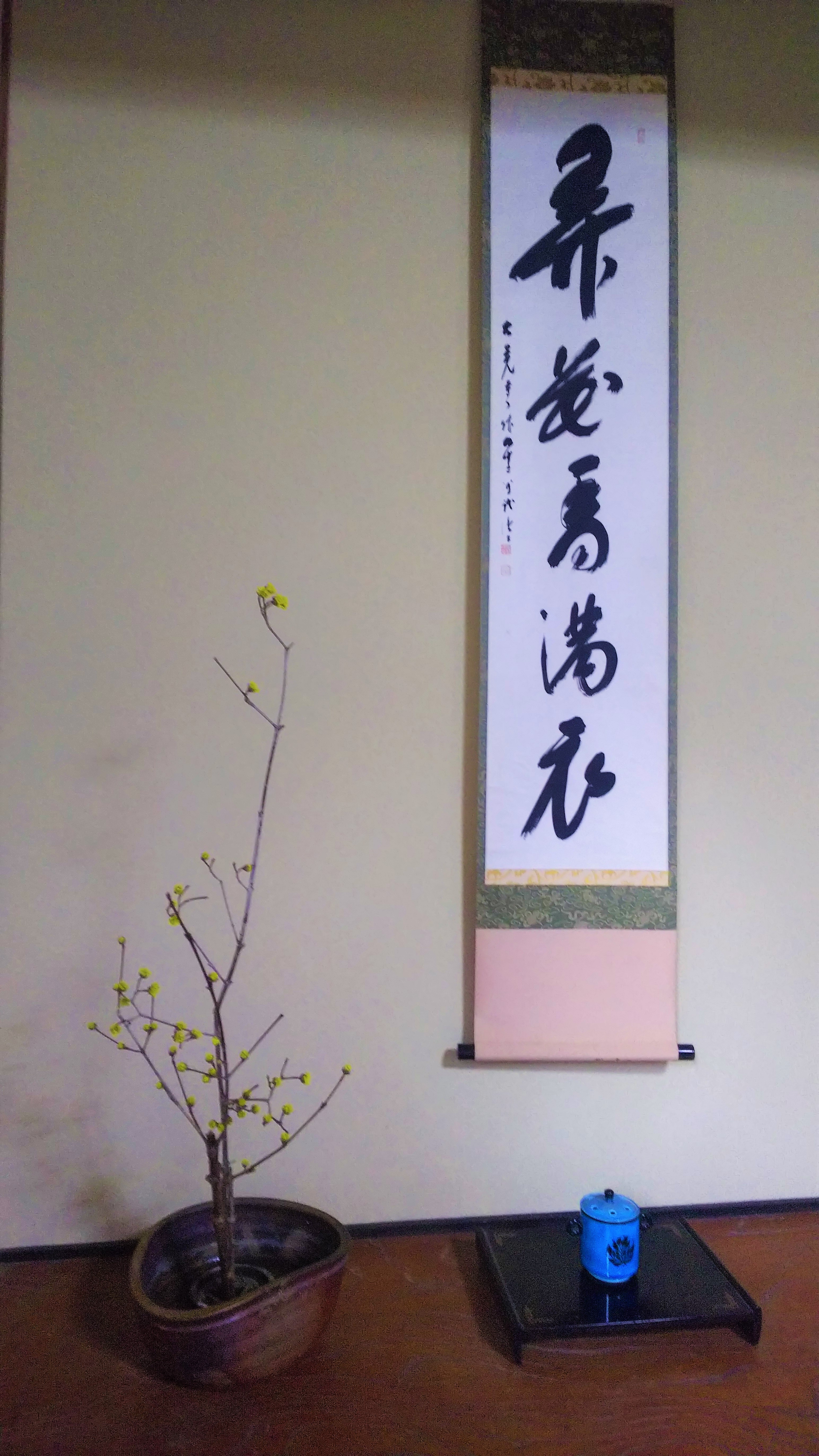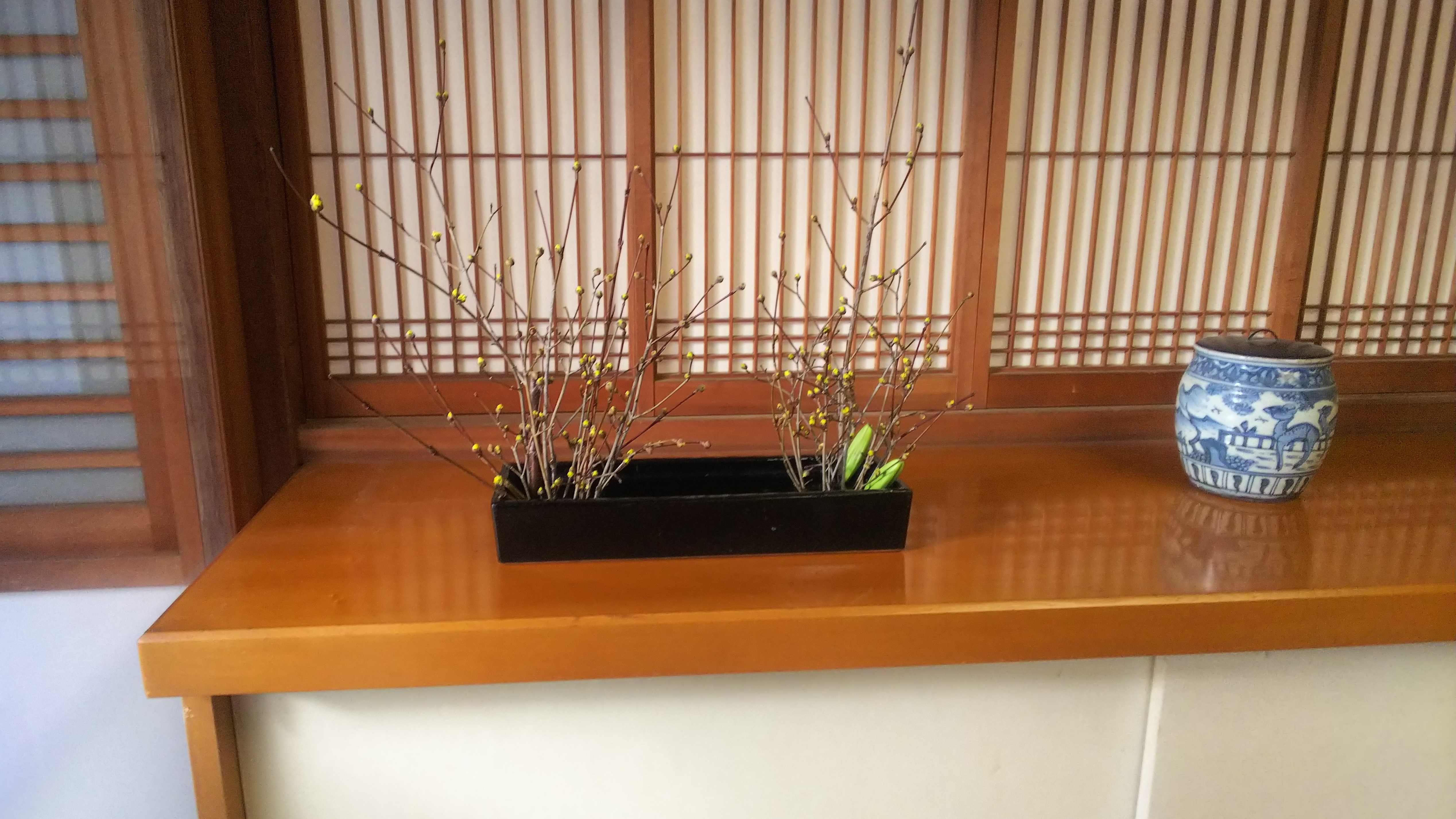 庫裡玄関・応接室・離れ床の間に活けられた山茱萸(サンシュユ)