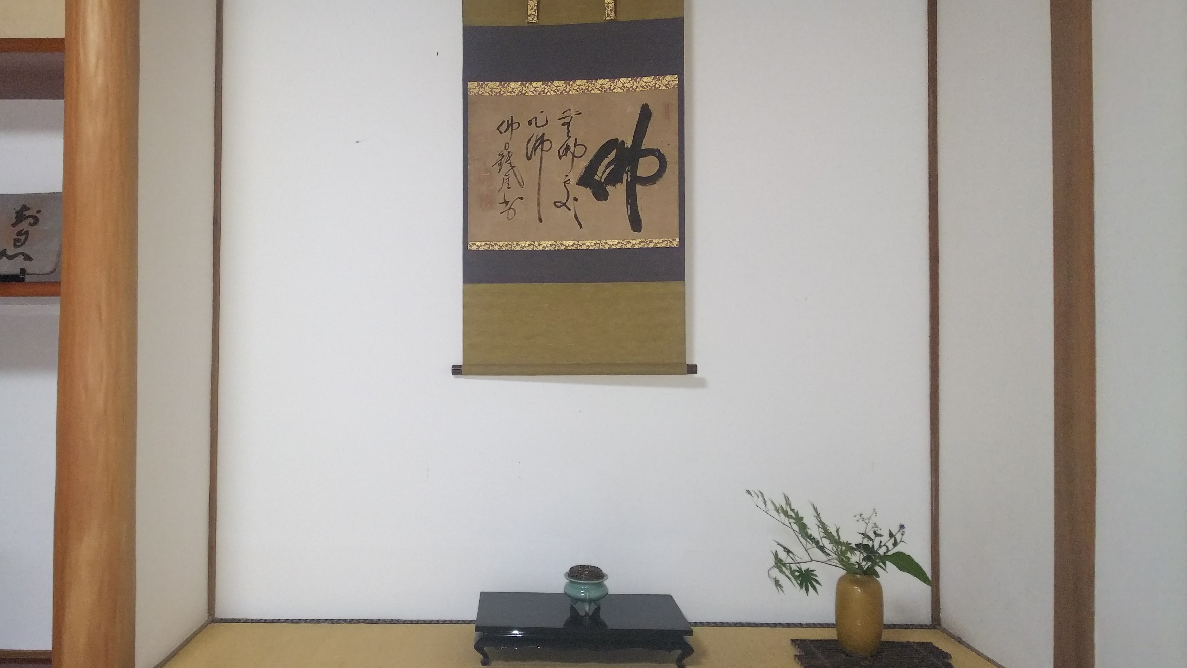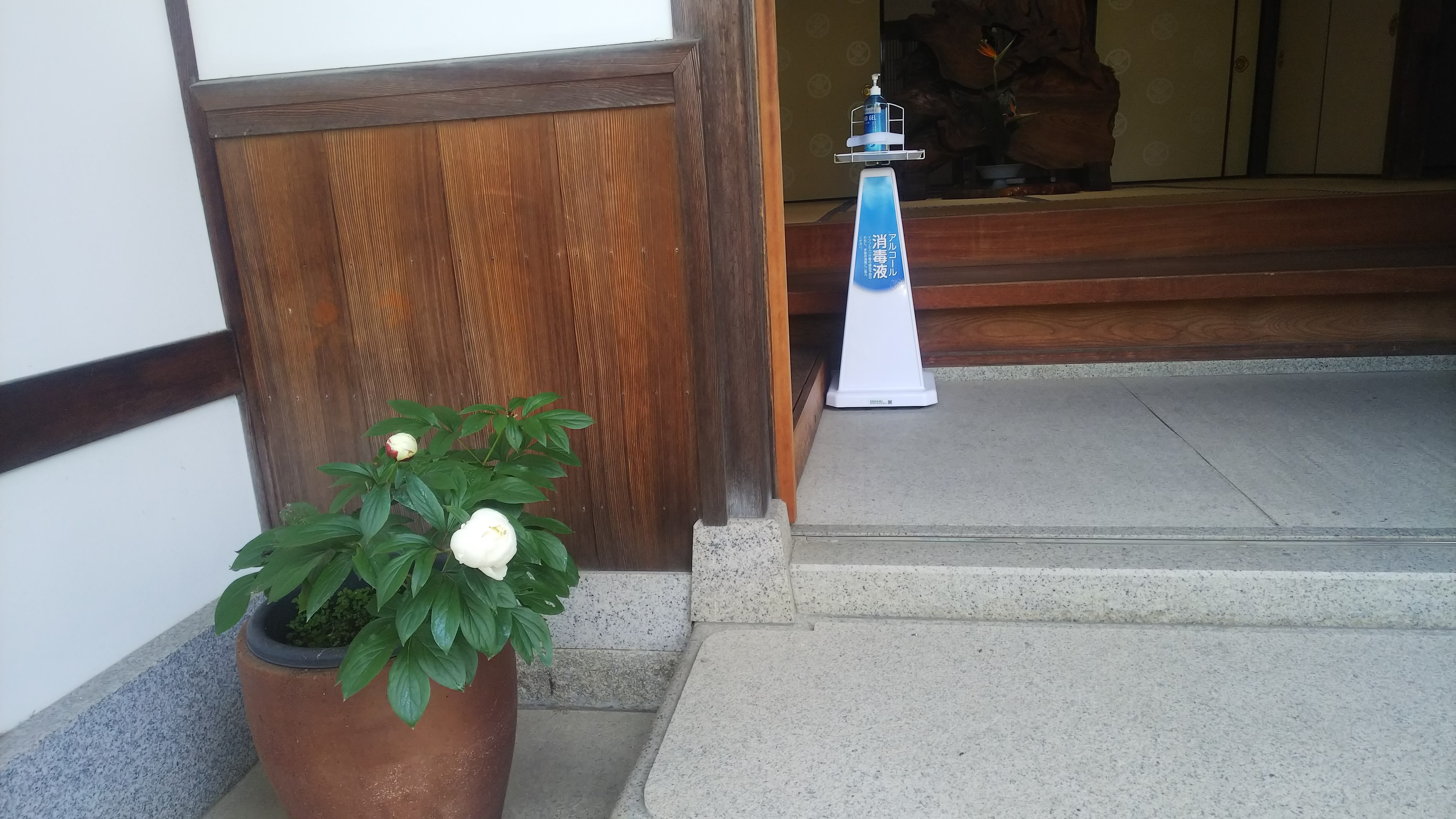 庫裡玄関前の鉢植え白牡丹、書院床の間に生けらたカエデ・雪の下・茗荷