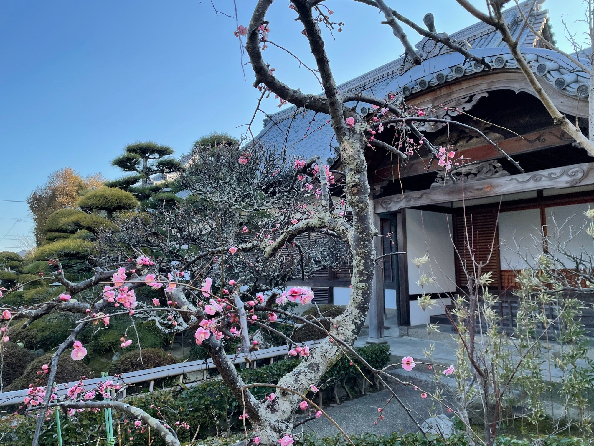 寒い毎日ですが、境内の表や裏山の梅の花が美しく咲いています。写真は玄関前の紅梅と白梅です。